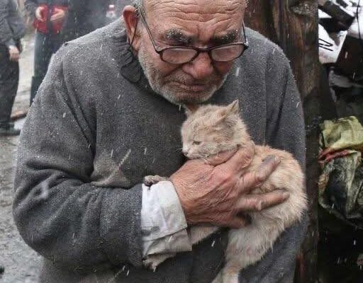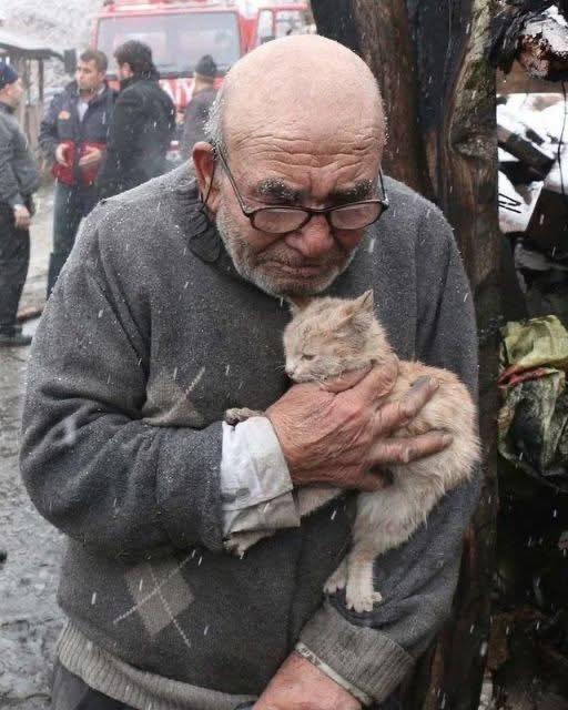 He just stood there, clutching the tiny, shivering kitten against his chest. His hands—rough, trembling—shielded her from the cold, his sweater speckled with soot and falling snow.
