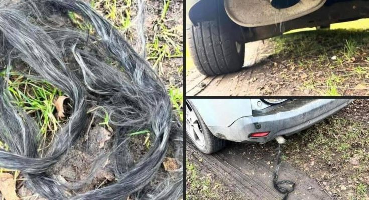 They thought it was human hair coming from the car” 🚗😱 A routine drive turned into a viral mystery when this family spotted something horrifying dangling from their muffler—until the hilarious truth came out. See the bizarre video and the real explanation in the article below 👇