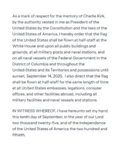 As a mark of respect for the memory of Charlie Kirk, by the authority vested in me as President of the United States by the Constitution and the laws of the United States of America, I hereby order that the flag of the United States shall be flown at half-staff at the White House and upon all public buildings and grounds, at all military posts and naval stations, and on all naval vessels of the Federal Government in the District of Columbia and throughout the United States and its Territories and possessions until sunset, September 14, 2025.