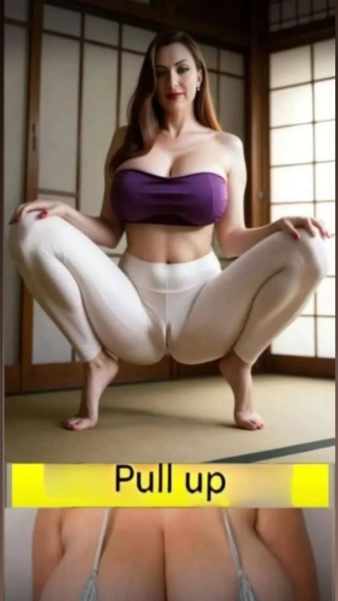 This may contain: a woman with long brown hair wearing jeans and a bra top is posing for the camera