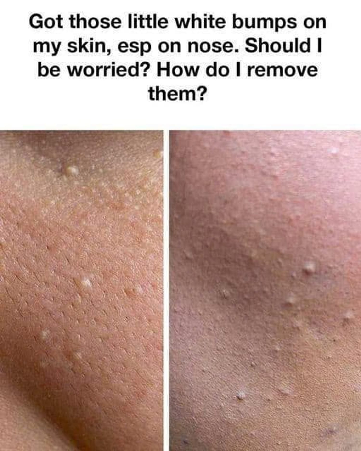 Milia is often seen as tiny white bumps on the nose, chin, or cheeks, and can also be seen on other areas of the body.