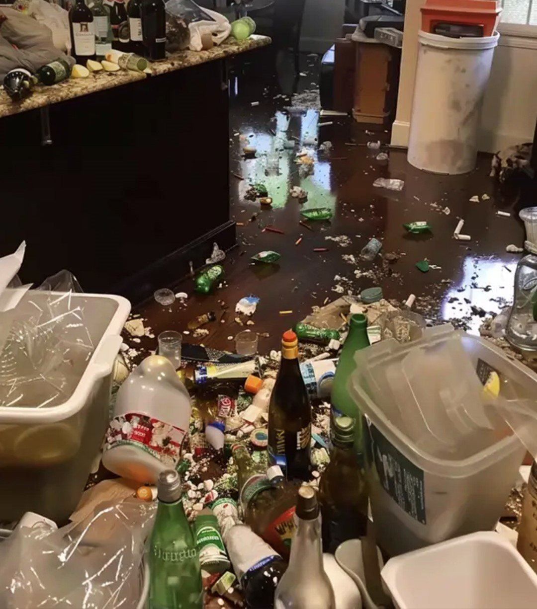A messy house with empty bottles, dirty plates, and trash strewn everywhere