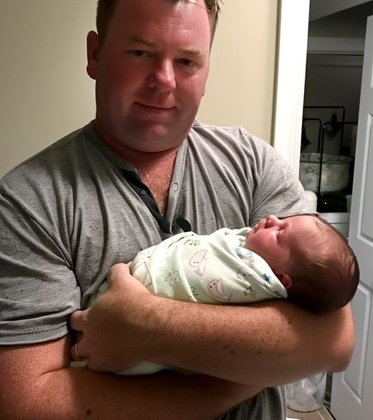 James looking weary while holding Lily