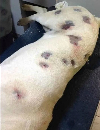 There were so many that the vet had to shave almost all of Jackson’s fur to take out the plastic shells. He removed 27 bullets in total and was forced to leave 20 where they were.