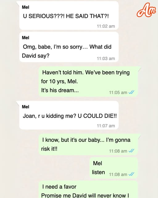 I know, Mel. But it’s our baby. I love him or her. I’m going to risk it, his wife said.