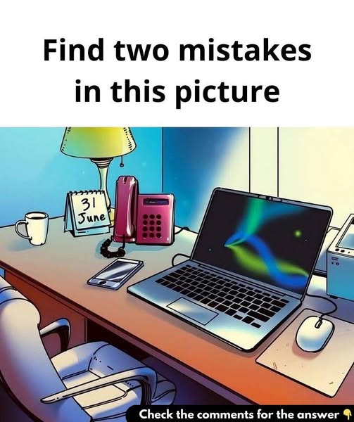 The challenge of spotting two mistakes—“31 June” on the calendar and the missing space bar on the laptop—shows how easily small details can go unnoticed. Visual puzzles like this test your ability to see what others might miss, making them a fun and rewarding way to improve your cognitive skills.