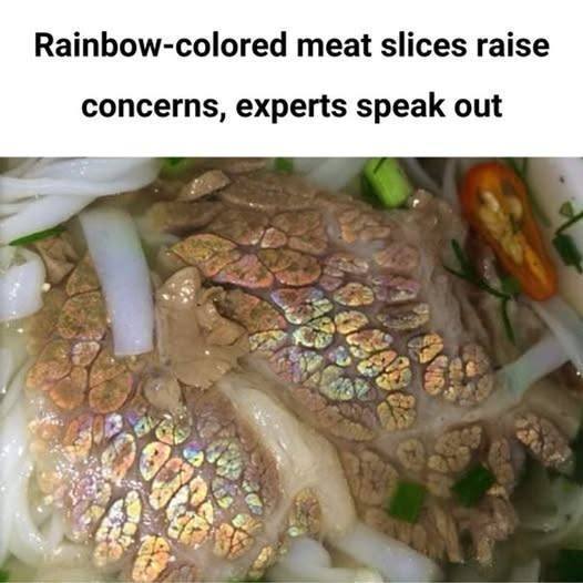 During cooking, many people may have encountered a situation where, while slicing beef or pork, they noticed a rainbow-like reflection on the surface of the meat. When seeing this, many might question whether the meat is spoiled or contaminated with metal, assuming that such a strange color could only result from such issues.