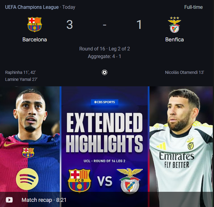 Barcelona are officially through to the quarterfinals of this season’s UEFA Champions League thanks to a 3-1 victory over Benfica in the second leg of their Round of 16 tie at the Montjuïc Olympic Stadium on Tuesday evening. Barça were the better team from start to finish and cruised to a comfortable win at home, with Lamine Yamal and Raphinha putting on a show to lead the Blaugrana to the Last Eight.